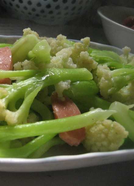 做法:把花椰菜洗干净,摘成小朵,放入沸水中焯一下,捞出备用,把火腿切成片,在锅里放油烧热,放入花椰菜翻炒至差不多熟,再放入火腿片炒匀,然后加入盐和肉汤烧至熟,最后加入味精调味即可,火腿烧花椰菜就搞定了。