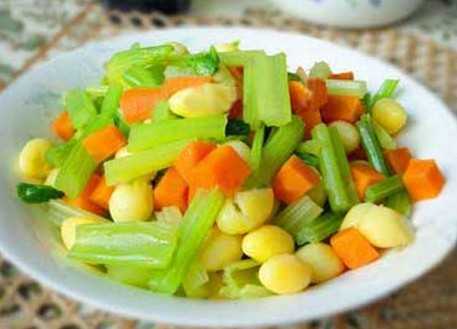 做法:把银杏洗干净,放入锅里,加水煮熟,捞出沥干水,把芹菜洗干净切段,胡萝卜去皮切丁,把胡萝卜焯一下,捞出过冷水,再放入芹菜焯一下,捞出过冷水,沥干水备用,把胡萝卜、芹菜和银杏放入碗里,加盐、鸡精橄榄油搅拌均匀即可,银杏拌芹菜就搞定了。