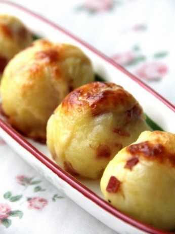 做法:把马铃薯去皮洗干净,切块,放入锅里煮熟,捞出放凉压成泥,加入盐和胡椒粉搅拌均匀,把培根切片,锅里放入黄油烧热,再放入培根煎香,取出再切成小块,然后放入土豆泥里搅拌均匀,再捏成小丸子,摆在烤盘上,在上面撒上两种奶酪,再放入烤箱里烤二十分钟即可,奶酪土豆泥球就搞定了。