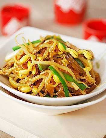 做法:把豆芽洗干净,猪肉洗干净切成丝,加入盐、料酒、生抽和生粉腌十分钟,把粉条放入锅里煮熟,捞出备用,海带和青椒切成丝,在锅里放油烧热,炒熟猪肉,装盘备用,再在锅里放油烧热,爆香姜葱,放入豆芽翻炒至几下,再放入粉条和海带炒匀,再倒入小许水焖至汁变浓,再放入猪肉和青椒翻炒至熟即可,黄豆芽炒粉条就可以出锅了。