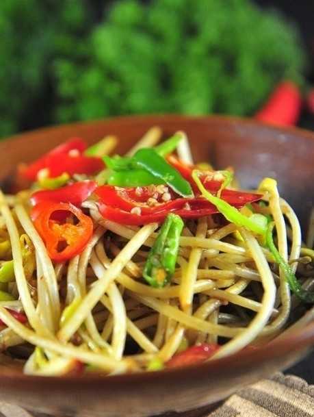 配料:把绿豆芽去掉根部,洗干净沥干水,把尖椒去籽洗干净切丝,在锅里放水烧开,放入绿豆芽焯熟,捞出过冷水,在锅里放油烧热,放入剁椒炒香,再放入尖椒翻炒片刻,然后倒入豆芽炒匀,再洒放少许水焖一下即可,剁椒绿豆芽就可以出锅了。