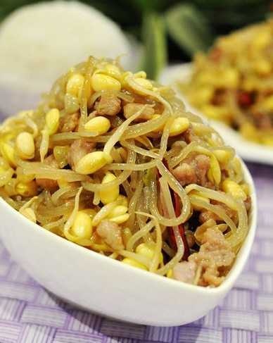 做法:把黄豆芽洗干净沥干水,把猪肉洗干净切成条状,把葱切葱花,姜切丝,在锅里放油烧热,放入八角爆香,再放入猪肉翻炒至变色,然后放入姜葱炒匀,淋上酱油,再倒入黄豆芽大火爆炒至熟即可,肉炒黄豆芽就可以出锅了。