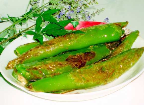 3、在锅里放油烧热,放入尖椒煎至两面起皮,然后加入料酒、糖、醋、酱油和少许水煮开,再放入姜蒜焖至熟透,最后,用水淀粉勾芡即可,虎皮青椒即做好了。