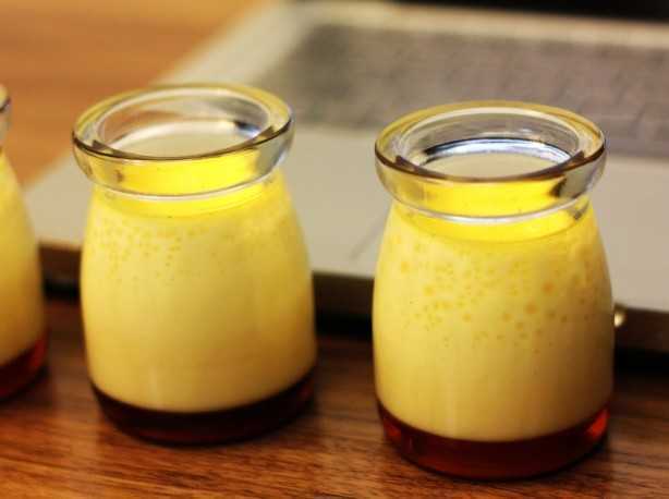 4:将布丁瓶放入烤箱水浴法150度60分钟,取出,再往布丁表面倒入小许糖浆,冷藏两小时以上食用味道更佳。