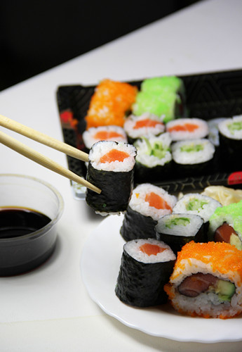 做法:先将米淘洗干净放进蒸锅里蒸得软硬适中,趁热时放进香油、盐和芝麻搅拌均匀,将黄瓜和胡萝卜洗干净切成条,用盐腌一下,火腿切成条,将鸡蛋煎成鸡蛋饼再切成条,然后,把米饭铺在紫菜上,再放上黄瓜条、胡萝卜条、火腿条和鸡蛋饼条,现在开始卷啦,要卷得紧些,免得到时切时会散开,卷好后就切成长度一样的厚片,现在就可以享受紫菜包饭啦。