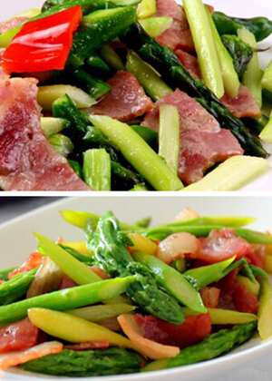 做法:把芦笋去掉根部和老皮再切段,培根切片,彩椒去籽切丝,葱切段,蒜拍碎,在锅里煮开水,把芦笋烫一下捞出,在锅里放油烧热,爆香葱蒜,再加入培根翻炒片刻,再加入彩椒和芦笋翻炒,然后加胡椒粉、鸡精和盐调味,芦笋培根小炒就出锅了。