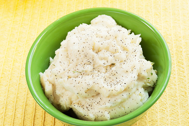 2、在土豆中加入盐、奶油、蛋黄、白胡椒粉,然后搅拌至泥状;