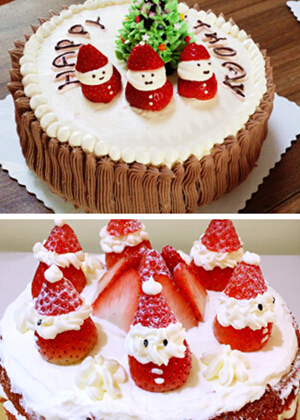 7、然后取两粒芝麻,放在草莓之间的奶油上做成眼睛,再取两点奶油捏成圆点,做成纽扣,圣诞雪人蛋糕即大功告成了。