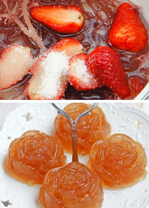 材料:血珊瑚50g,草莓50g,白砂糖50g,冷水200g。