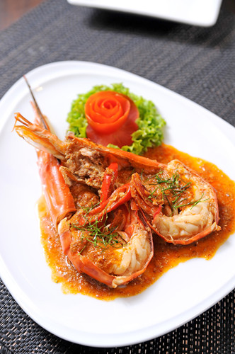 6、放入炸好的北极虾,沾上酱料,即可出锅上碟。