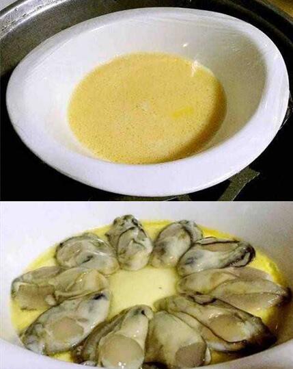 8、待蛋羹蒸到八分熟时,便将生蚝摆入蛋羹上继续蒸5分钟。