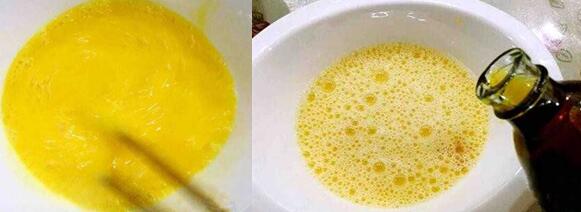 6、将打匀的蛋液倒入比例是1:1.5的生蚝原汁,后滴入香油搅拌均匀。