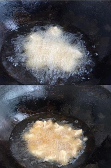 6、待鸡块炸至金黄后,便捞起,稍凉,油锅升温后,再把鸡块入锅复炸,捞出沥油。