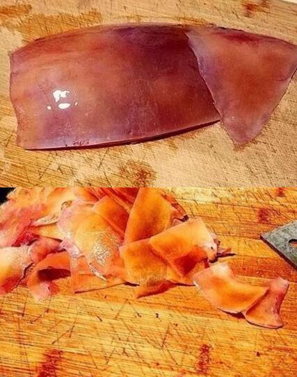 2、撕去雨皮,朝尾部方向斜切成薄片。