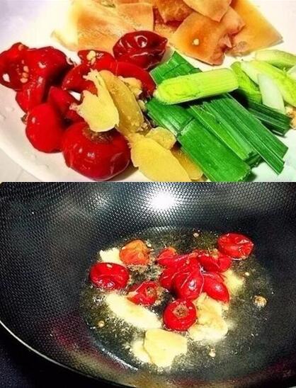 4、用中火热油,下花椒、泡姜以及泡海椒。