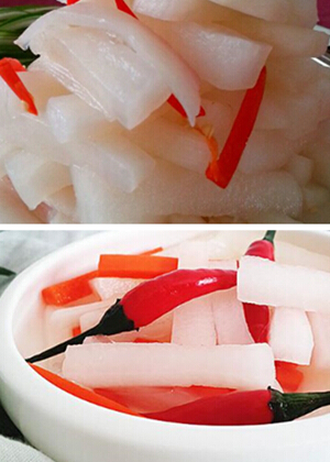 4、再放置半小时,然后放入红辣椒拌匀,酸甜爽口的酸甜萝卜就做好了。
