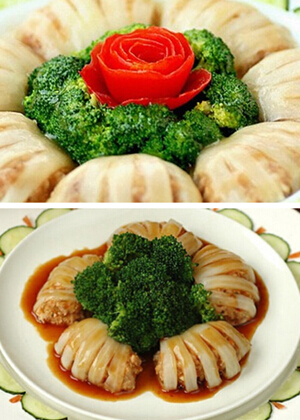 7、把西兰花洗干净,瓣小朵,放入沸水中焯水,装盘,然后摆上佛手,再淋上芡汁即可。