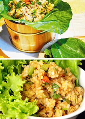 9、取一张白菜叶,放入米饭、土豆泥、鸡蛋酱,再撒上香葱和土豆丝,然后加入香菜和香辣酱,再包成四方块,即可食用了。