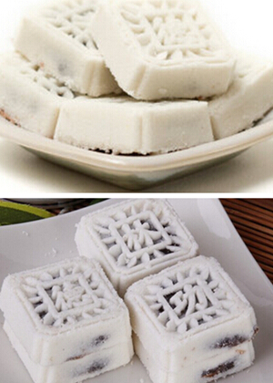 小贴士:有些地方加红色是为了喜庆,一般要送到女方家去的印糕都是要加红的。