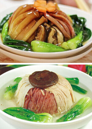 温馨提示:此菜火腿丝、鸡丝、笋丝要长短一致,粗细均匀。