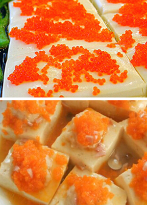1、将蟹子磨成浆汁并加热,使之凝固成豆腐状,即成了蟹子豆腐。