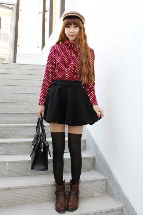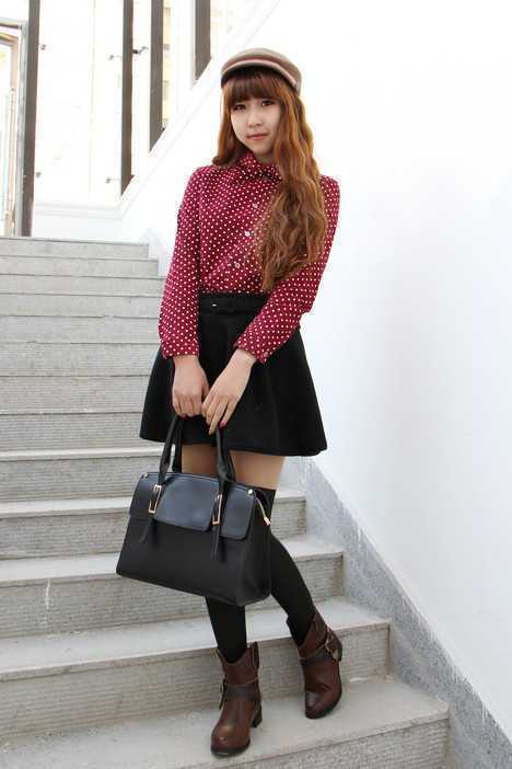 装饰着金色金属皮扣的黑色包包,搭配复古的红色小波点衬衫,超有复古feel的设计,搭配高腰黑色短裙,棕黄色短靴子,更显复古味道,随手一领起酷酷的机车包包,散发出儒雅温柔气质,打造完美复古小女生。