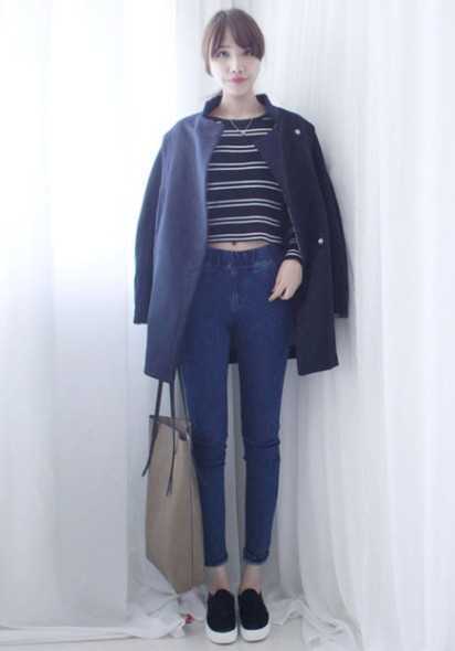 大牌范的浅白灰大包包,非常精致的做工,搭配时尚藏蓝色毛呢大衣,内搭超显瘦的短款横条衫,再穿搭与外套同色系的紧身裤,尽显大牌女人范气,一款人气爆登的冬季大包包搭配,轻松打造出十足的大牌女人范气。