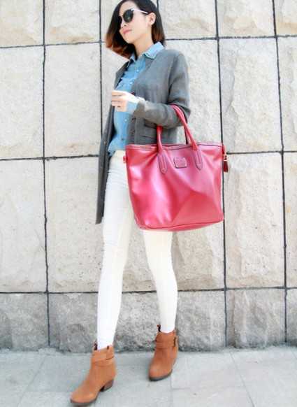 简约的包包设计,内容量非常大,实用又时尚的冬季必备单品,大气爆登的冬季大包包,搭配韩范的针织衫开衫,下身穿搭高腰白色紧身裤,穿起来非常的抢眼潮流。