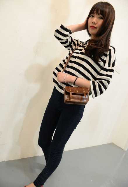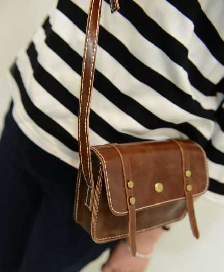 春季棕色斜挎包,迷你的款式,轻便又时尚,搭配条纹T恤衫,很清爽时尚,搭配黑色小脚裤,尽展出休闲时尚风呢!