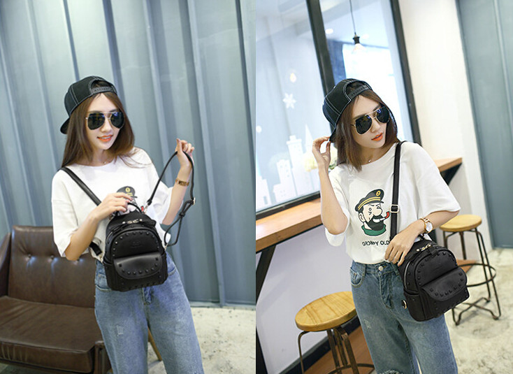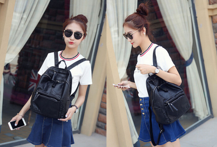【双肩包搭配04】黑色的双肩包容量超大,非常适合外出旅游,而外出旅游怎能缺少一身好装扮呢?干净直接的T桖上衣大方自然,搭配高腰的半身牛仔短裙尽显青春活力,还能立显好身材,绝对是街上靓丽的一道风景线喔!