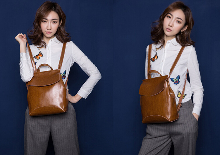 【双肩包搭配05】休闲的刺绣白衬衫时髦正式,配上西装裤的装扮就更显知性大气的女性风格,看起来超级时髦。再搭配着棕色的皮质双肩包,整个人都十分地高档有气质,非常适合职场中的白领女性喔!