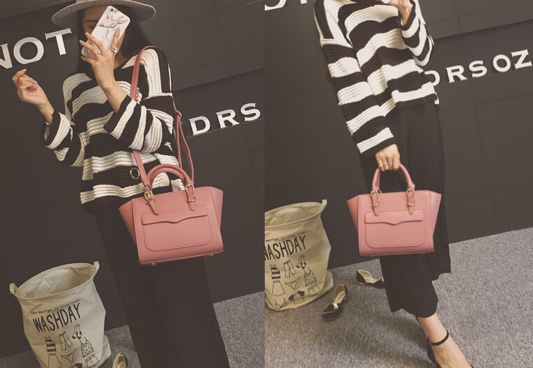 【秋季包包搭配04】粉色系的单肩包高贵大气,而且相当地百搭。简单的黑白横条上衣以及黑色阔腿裤的搭配都让女生充满知性的气质,即使是粉嫩的包包都能不会让造型出错,而灰色的帽子更是让整个人充满英伦范。