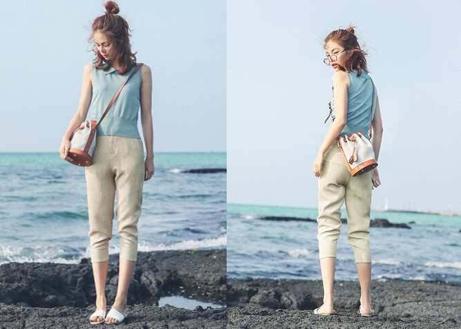 【秋季包包搭配02】复古类型的水桶挎包时髦又百搭,饱满的外形让包包超有气质,而搭配着针织类型的无袖上衣以及棉麻材质的七分裤,更显休闲自然的风格,一双随性的平底拖鞋为造型起到画龙点睛的作用,非常适合刚刚迈进清爽的初秋。
