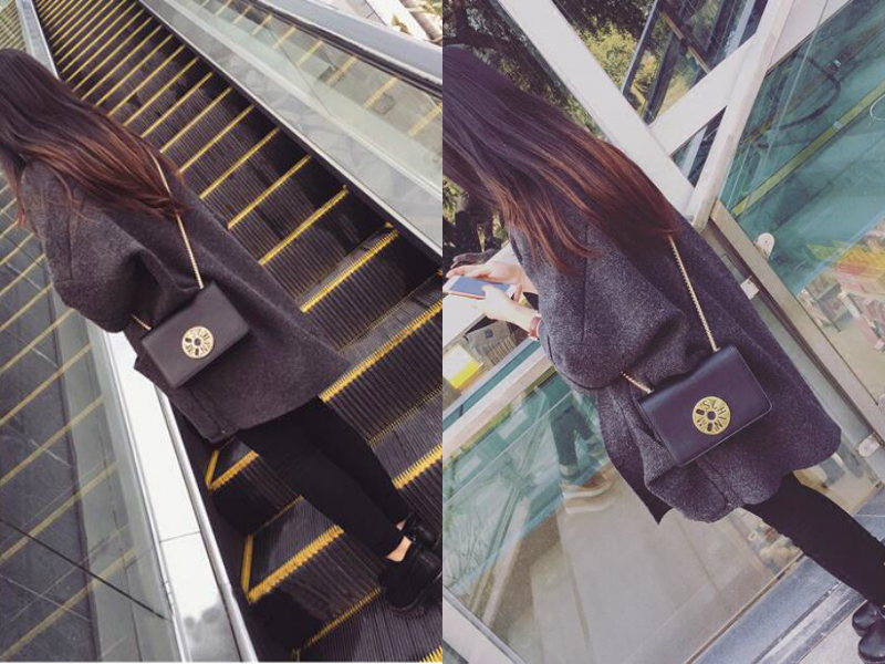 宽松高领的毛衣成熟有魅力,灰色的包臀紧身裙也是完美的搭配,加上休闲迷你的黑色斜款包,在色彩上搭配相当协调,而且透露了休闲优雅的感觉。