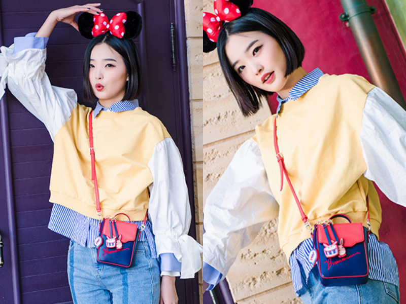 撞色斜跨包在今年很是流行,红蓝两色碰撞很是养眼,搭配一件同样是撞色的拼接型宽松上衣,完全不会因为颜色太多而让人觉得眼花缭乱,小小的挎包背在一侧,抢眼得来又很搭,加上妹子头上还戴着一个米奇头饰,所以更加觉得这个迷你斜跨包背在她身上非常可爱俏皮。