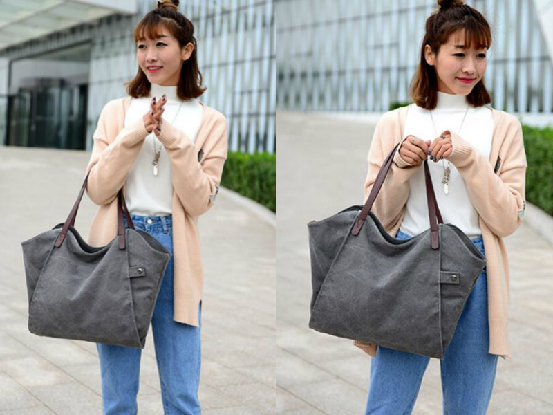 这款单肩帆布包体积较大,不管日常还是旅游带着都适合,倒也实用百搭,深灰色的帆布包与妹子的粉色针织衫搭配在一起也不和不和谐,反而显得妹子温婉大方,下身再穿一条浅蓝色的牛仔长裤,简约中彰显文艺气质,看着很舒服。