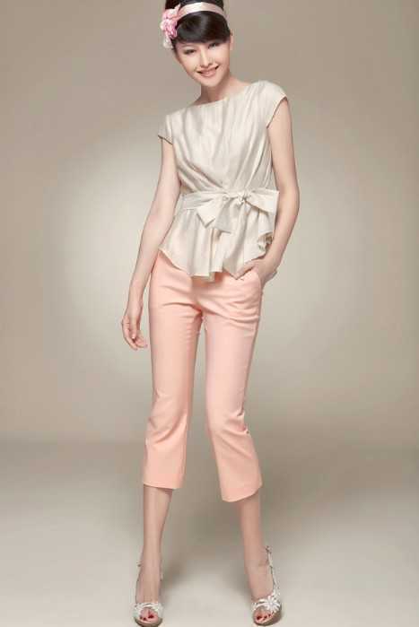 很lady的OL搭配方案,上身和下身的面料一致的情况下显得特别的协调,米色的上衣搭配香槟色的休闲裤子,很有女人味,又很有职场女性的优雅气质。