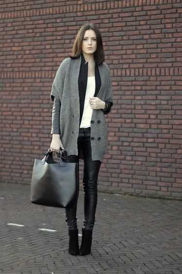 黑白灰的搭配,给人层次分明的设计感,白色的打底T十分简约,搭配一条黑色的亮面皮裤,更显时尚感,一件假两件的针织拼接外套,立体感十分强烈,黑色的尖头短靴,展现了女性的硬朗个性和独立干练的气息。