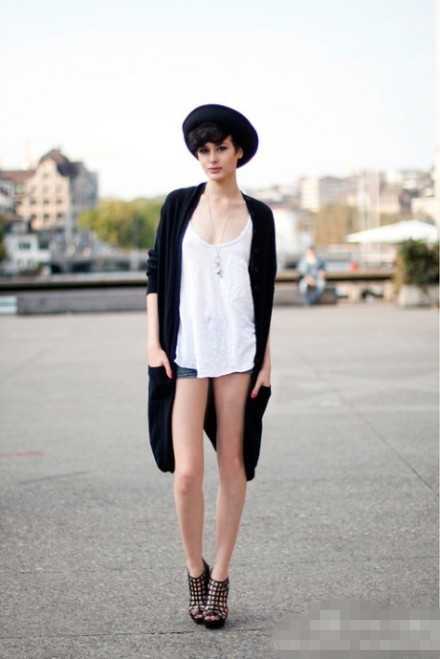 一件白色的大领白T,紧身的小牛仔短裤若隐若现,十分性感迷人,搭配一件针织的长款风衣,层次凸显,戴上一顶帅气的帽子,更显时尚个性,脚上穿的格子镂空小短靴也是十分性感迷人哦。