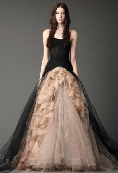 黑色的婚纱永远能给人神秘的冷眼皇后的感觉,摇滚天后艾薇儿结婚也是穿着Vera Wang设计的黑色婚纱哦,所以说黑色的婚纱特别适合不羁有个性的MM,这款黑色的婚纱独特之处在于下摆的拼接,黑色的薄纱里包裹着香槟色的花苞设计,立体感十足哦。