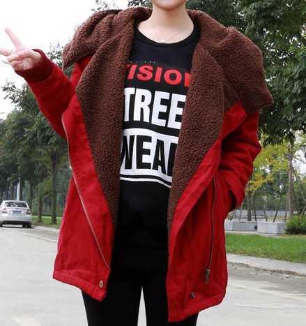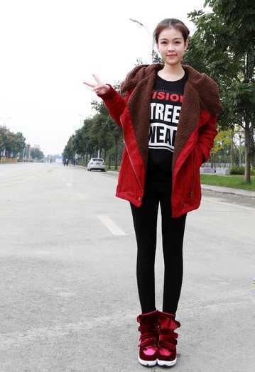 大红色的外套与内里棕色毛绒撞色,让简单的红色外套变得时尚大方。内搭黑色卫衣,在凛冽冬日里让温暖完美升温,修身的黑色紧身裤,搭配酒红色毛绒休闲鞋,洋溢出恬静完美的女性气质,成为甜美街拍达人。