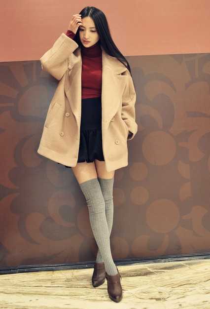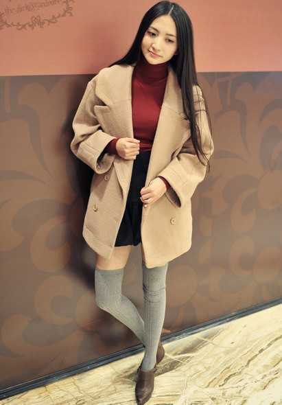 一款宽松型的毛呢外套,简约又时尚,大翻领设计显得出大牌潮流气息,内搭酒红色绒面很保暖,黑色毛呢短裤配上巧妙显高的过膝袜子,给人一种清雅文艺范儿,走在街上难免会受到不少男士亲睐噢。