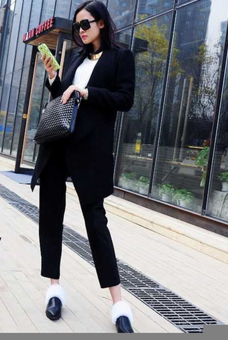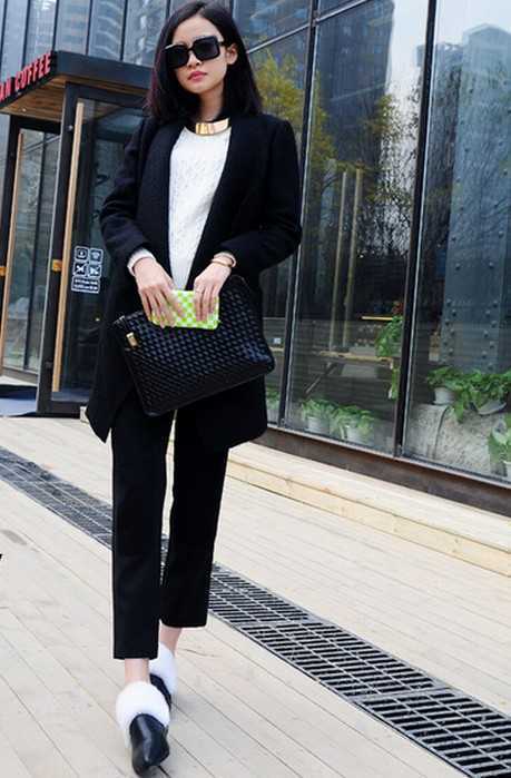 搭配黑色直筒裤,很帅气干练,配上纯白毛绒绒鞋子、亮眼金色项链、神秘的黑眼镜装饰着,呈现出干练职业女性魅力,喜欢经典黑白配的女生不妨尝试一下。