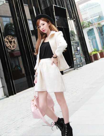白色时尚的毛呢外套,内搭简单的黑色背心,很简约好看,下身搭配百搭裙子,装扮出职业套装无限魅力,搭配黑色高跟鞋和简单的毛呢礼帽,增添整个人的亮丽色彩。