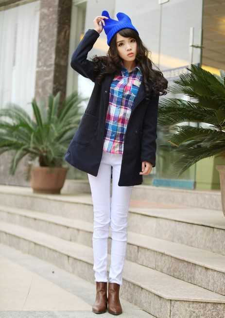 格子的衬衫永远也不会显得落伍。外搭一件黑色的毛呢外套,下身可以搭配白色的紧身裤和卡其色短靴。这样的搭配既随意,又不失时尚感!