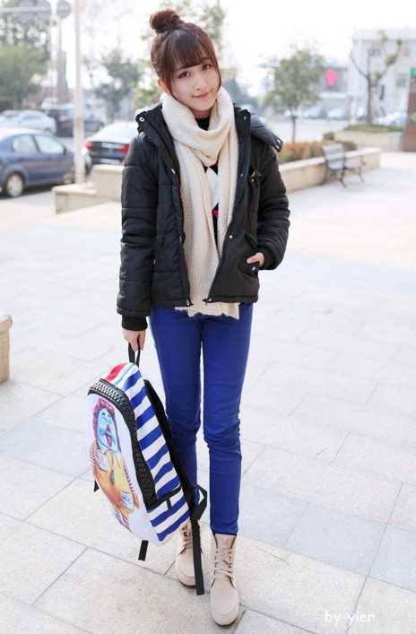黑色的棉服外套很百搭而且纯净,可以内搭一件卡通的T,下身搭配色彩较鲜艳的蓝色紧身裤,裸色的棉靴和围巾相呼应。这是休闲的搭配!