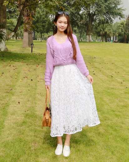 白色蕾丝飘逸长裙,搭配浪漫紫色毛衣,穿出甜蜜感十足冬装,随手拎着时尚棕色包包,完美穿出新年甜美约会LOOK!