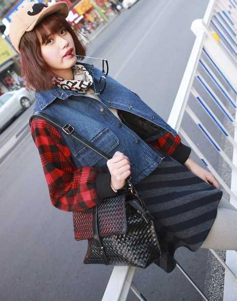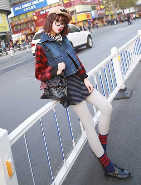 独特的格子袖子短外套,内搭简约白色打底衫,搭配复古毛呢迷你短裙,穿出时尚复古范儿,随意到黑色鞋子和英伦范的袜子,超显高显气质的冬装。