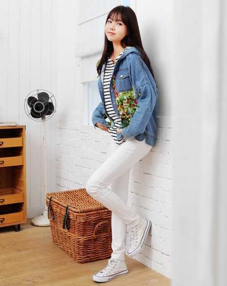 宽松款的复古花朵牛仔外套,搭配百搭条纹打底衫,穿出百搭时尚范儿,搭配净白色紧身打底裤,尽展甜美气质时尚装扮。