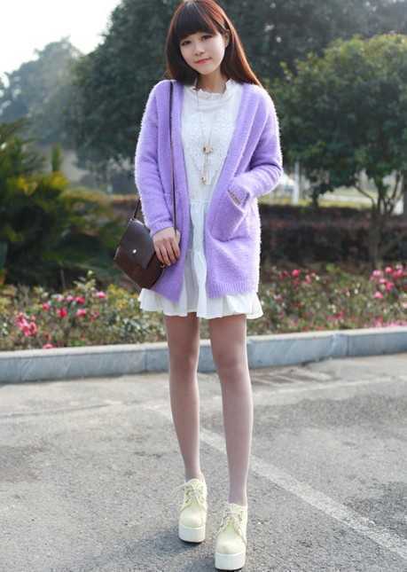 充满浪漫的紫色春季针织开衫,搭配仙美白色连衣裙,凸显出甜美感,加上厚底时尚松糕鞋,轻松穿出仙美又舒适的装扮。